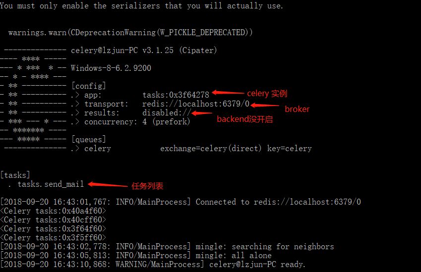 -A: 指定 celery 实例所在哪个模块中,例子中,celery实例在tasks.py文件中,启动成功后,能看到信息